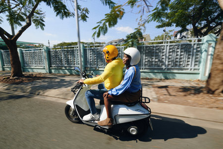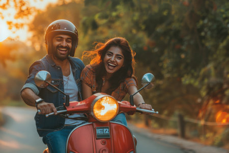 Excited couple on scooter exploring nature in India, helmets on for adventure travel getaway