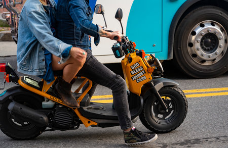 Attractive couple riding a scooter on a sunny day in the city