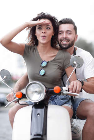 Beautiful young couple is smiling while riding a scooter