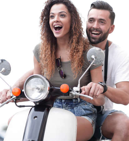Happy cheerful couple riding vintage scooter. Travel concept.
