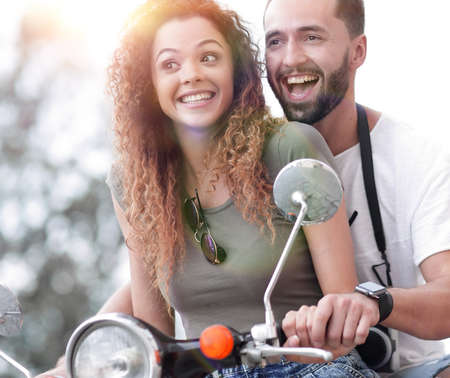 Happy cheerful couple riding vintage scooter outdoors.