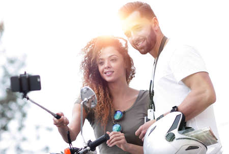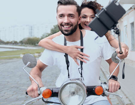 Happy couple on scooter making selfie on smartphone outdoor