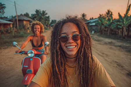 Two women are riding scooters on a dirt road at sunset, surrounded by lush tropical scenery and a warm, vibrant atmosphere.