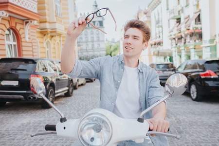 A handsome bearded man rides a scooter around the city in summer.