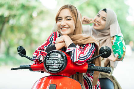 portrait of happy muslim friend riding motorcycle scooter together outdoor