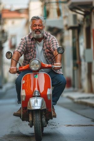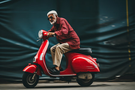 Cruising on Wheels: A Captivating Capture of a Man Riding a Vibrant Red Motor Scooter
