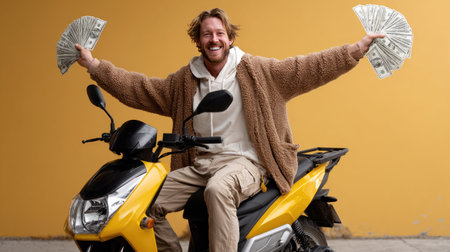 A joyful man exuberantly celebrates his success while holding cash in both hands. He sits on a yellow scooter against a vibrant background, radiating happiness and excitement.