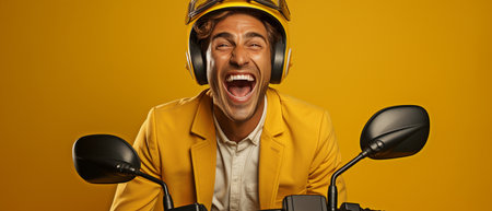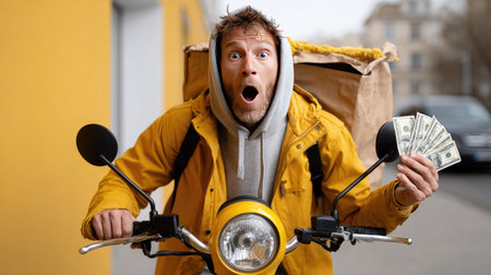 A surprised delivery man joyfully holding cash while riding a scooter against a vibrant yellow background. This image captures the thrill of urban delivery services.