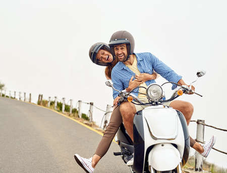 The lovebirds are hitting the road. Shot of an adventurous couple out for a ride on a motorbike.