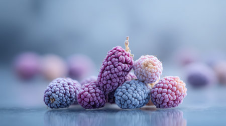 Close-up of several frozen blackberries with different shades of red