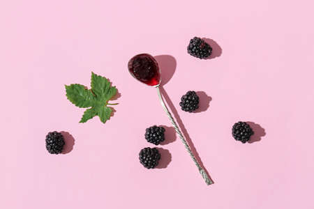 Spoon with tasty blackberry jam and berries on color background