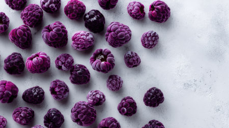 A stunning display of fresh purple raspberries against a light grey surface, ideal for illustrating healthy eating concepts, culinary art, and natural food aesthetics.