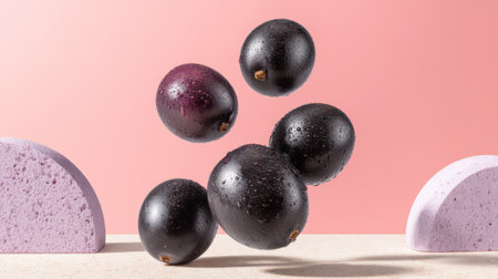 This captivating image showcases fresh purple grapes suspended in mid-air against a soft pastel background. Ideal for bright and modern projects, it captures freshness and vitality.