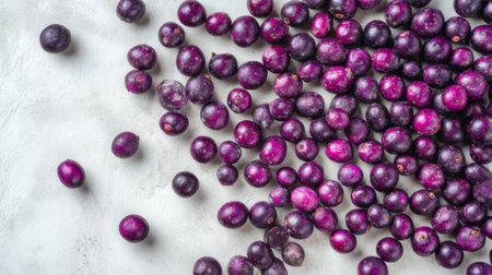 A vibrant collection of fresh purple berries scattered on a light surface, showcasing their natural beauty and texture, ideal for food photography and health topics.
