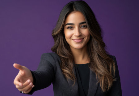 A smiling businesswoman offers a handshake against a purple background. She exudes confidence and success.