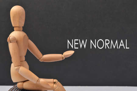 Wooden figure with text NEW NORMAL on black background. Selective focus.
