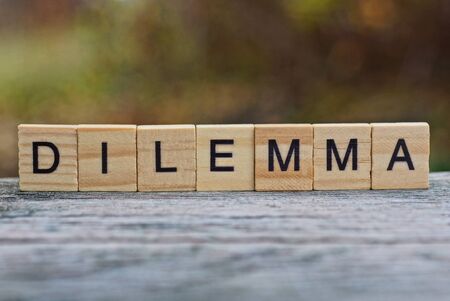 word dilemma made of wooden letters on a gray table