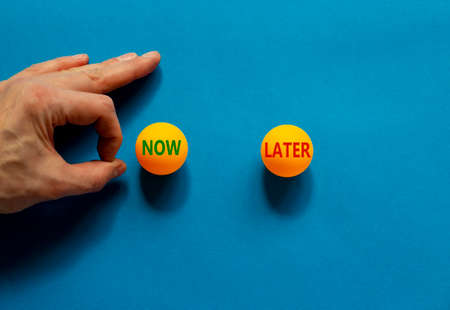 Now or later symbol. Male hand is about to flick the ball. Orange table tennis balls with words now later. Beautiful blue background. Business, now or later concept.