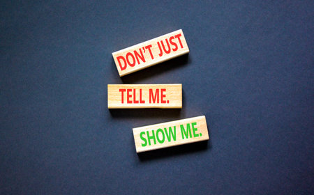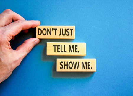 Tell or show symbol. Concept words Do not just tell me, show me on beautiful wooden blocks. Beautiful blue background. Businessman's hand. Business tell or show concept. Copy space.