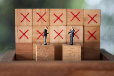 Miniature people : Businessman shaking hand front of X block it means select wrong