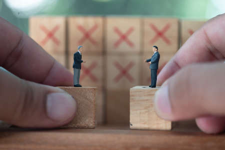 Miniature people businessmen deal or agreement standing on cube wood. Controlled by real people. Negotiating in business. as background business concept and strategy concept