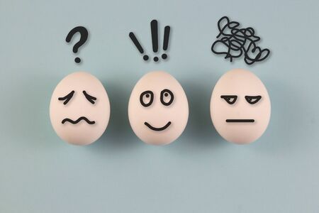 Chicken eggs with different emotions of joy, anger, indifference, anger. on a blue background. place for text.