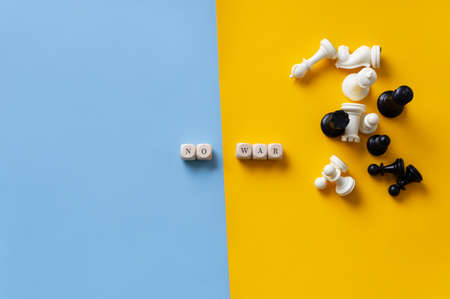 No War sign spelled on wooden blocks in a conceptual image of Ukrainian war over blue and yellow background.