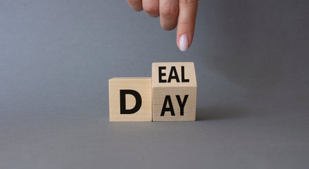 Deal of the Day symbol. Businessman hand points at turned cube with words Deal of the Day. Beautiful gray background. Business and Deal of the Day concept. copy space