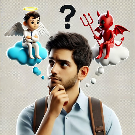 Young man thinking about a problem with an angel and a devil.