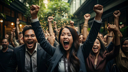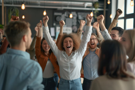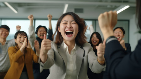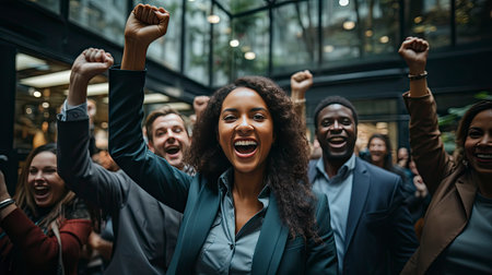 A diverse team of business professionals ecstatically celebrating their success in a modern office, expressing triumph and unity after achieving their goals
