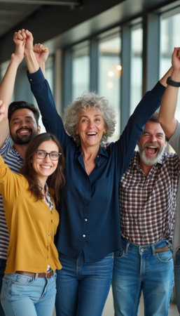 A diverse group of four adults, including a joyful older woman, are raising their arms in celebration, exuding happiness and camaraderie. Their vibrant expressions and casual attire reflect a moment of triumph and togetherness, perfect for conveying joy and teamwork.