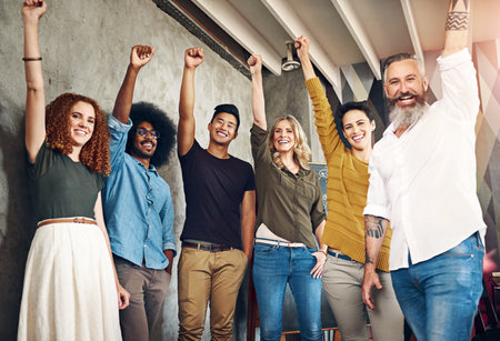 Casual staff team Celebrating success and having fun together. The group high-fived and shouted, yes we did it, hooray.
