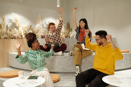 Joyful, excited diverse entrepreneurs are celebrating their success and the great work environment