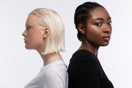Back to back. Young good-looking women with different skin color standing back to back near white wall
