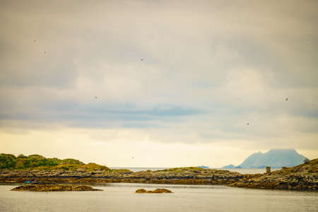 Rocky seashore with cloudy sky. Wilderness. Beautiful nature of Norway. Lofoten islands