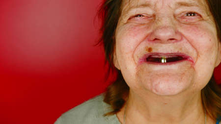 Mature woman on red background. Portrait of grandmother laughing with one tooth in mouth. Concept of age-related changes.