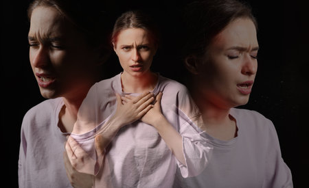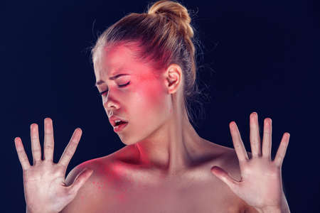 Young woman experiencing hallucinations after taking drugs. Substance abuse concept.