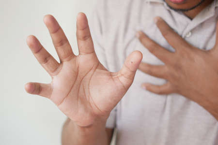Patient showing arm and hand with red itchy painful rash. Allergic symptom on male hands. Dermatology, skin care. White background, top view