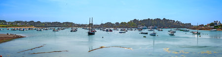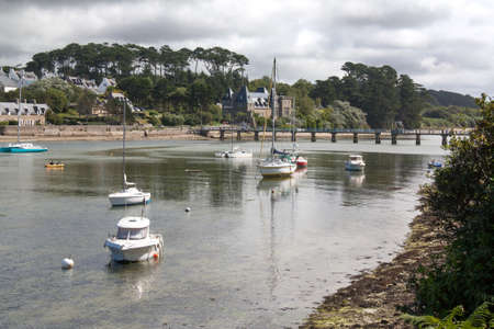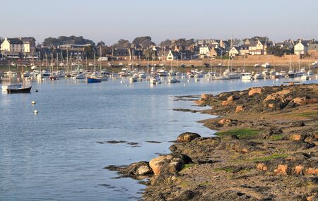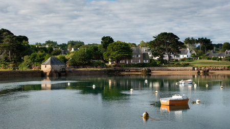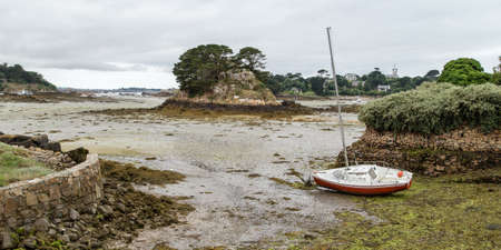 Ploumanach, France - August, 25 - 2020: Harbor of Ploumanach on a partly cloudy day in summer