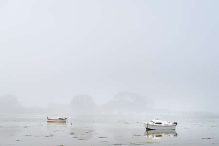 Lanilis, France - August 11, 2020: Old small boat lying on the beach, low tide, foggy day in summer