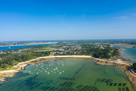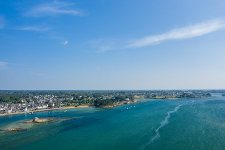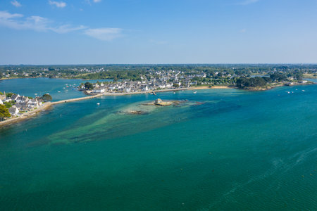 Wide aerial image of a coastal village along a turquoise tidal inlet in Etel, Brittany, with scattered white houses, green landscape, and clear blue sky creating a peaceful summer scene.