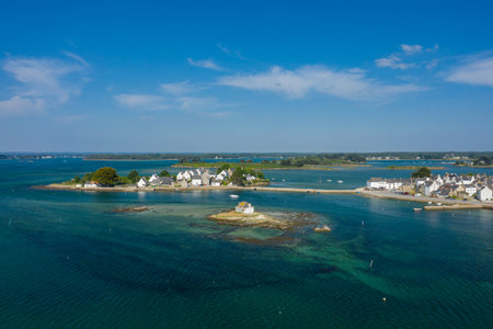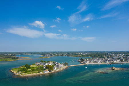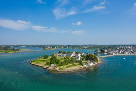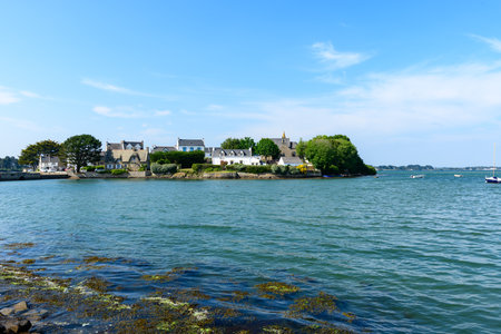 Etel, France - May 31, 2023: A view of Ile de Saint-Cado showing stone houses, a church with a steeple, trees, and greenery on the island, with water and several small boats visible under a clear blue sky.