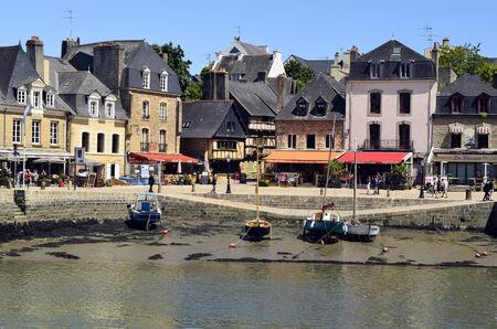 Auray, France - June 08, 2011: Unidentified people, buildings and restaurants in the medieval village in Brittany on river Loch