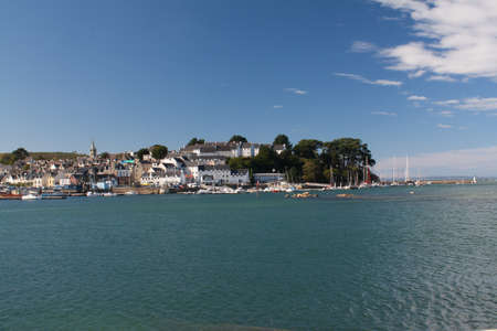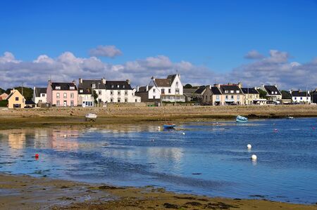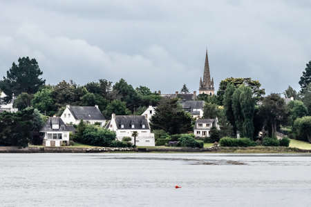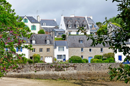 Saint-Cado in Brittany, beautiful houses in the village, on a small island, with the chapel in background
