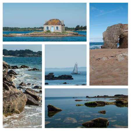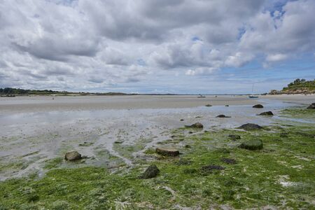 Beach at the coast of Brittany at low tide with seaweed, summer holiday feeling