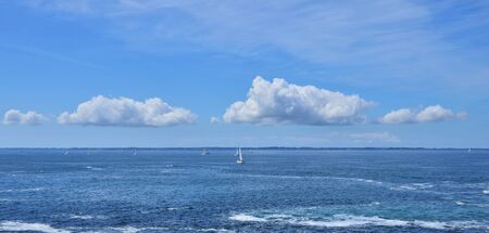 The wind inflates the sails of the boats on the ocean in the Quiberon region of France