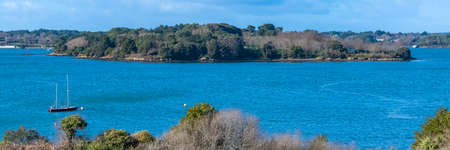 Brittany, panorama of the Morbihan gulf, view from the Ile aux Moines island, with a sailboat