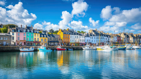 The vibrant houses of Douarnenez line the harbor, where boats peacefully float on the water, reflecting the charm of Brittany's coastal beauty under a clear sky.