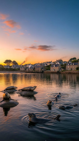 A serene scene of seals swimming in calm waters during sunset, with a picturesque backdrop of houses and a vibrant sky.