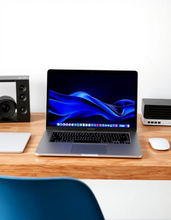 Top View Laptop Computer With Camera and Book on Wooden Table, Empty Space For Text